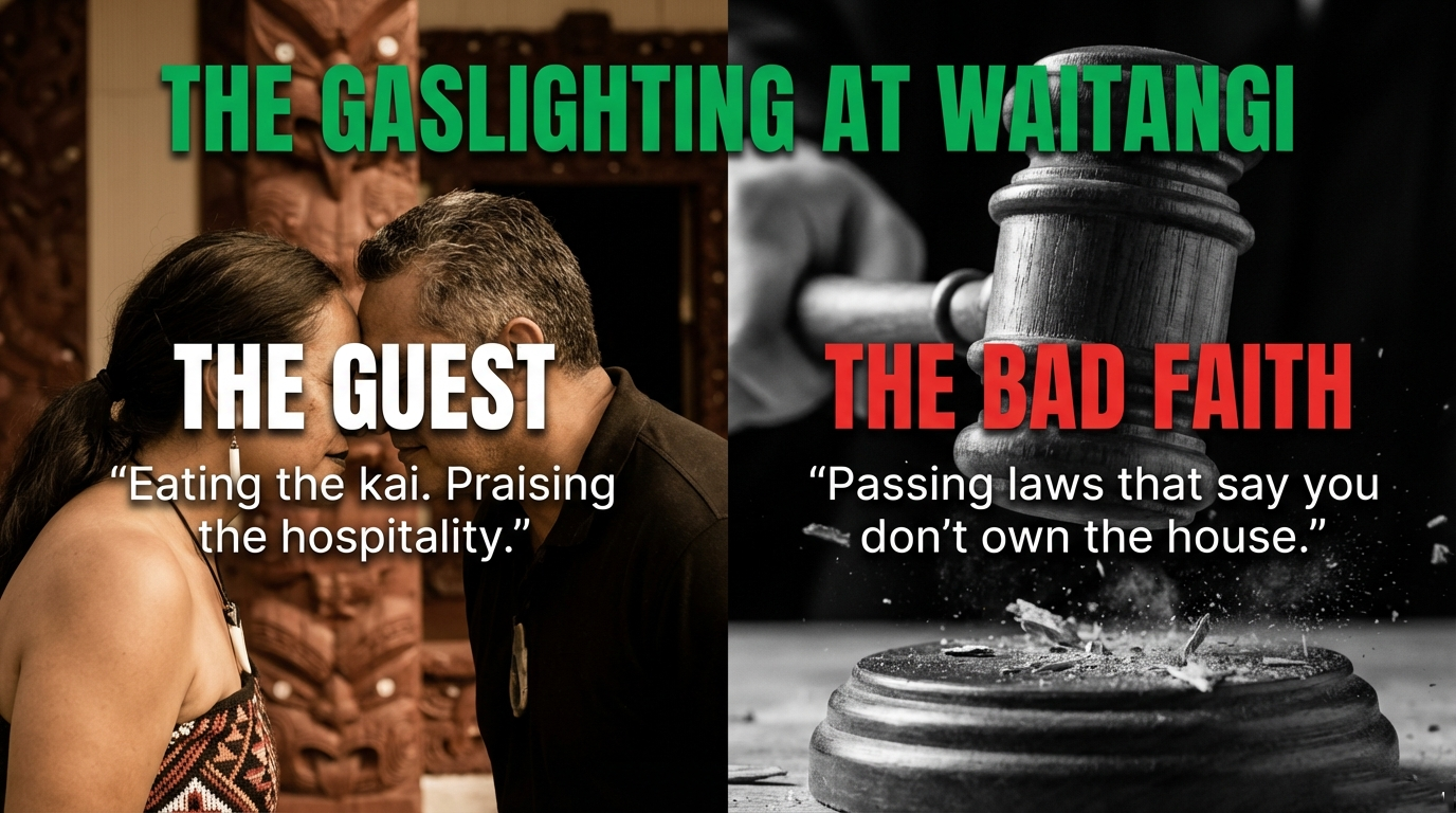 Seymour is the guy who insists on being welcomed to your house every year, eats your kai, praises your hospitality in front of the cameras, and then goes back to Parliament to pass a law saying you don’t actually own the house and shouldn’t get a say in the renovations.