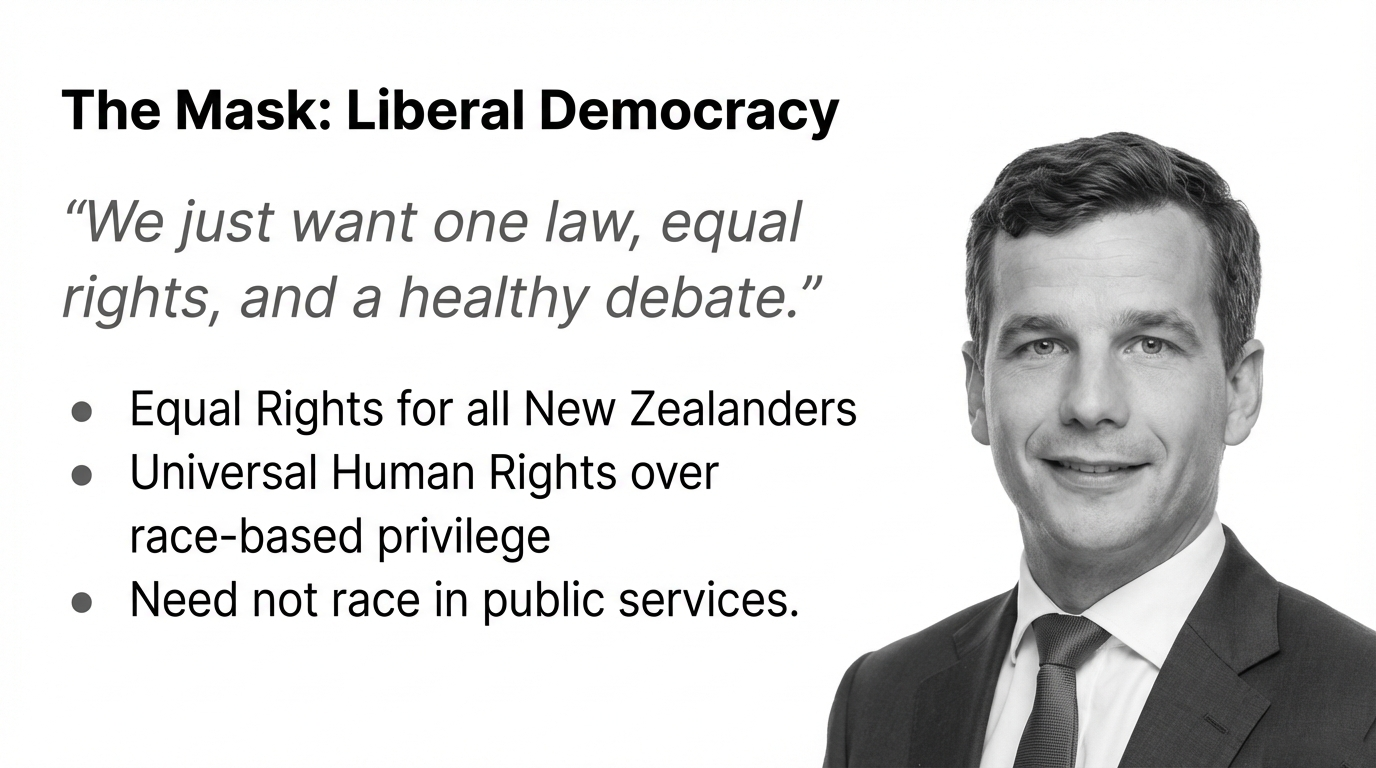 - Frames any structural Māori voice as “race‑based” and destructive of “universal human rights”, as in his anti‑co‑governance campaign statements reported by RNZ and restated on ACT’s site Defending Equal Rights & Democracy.