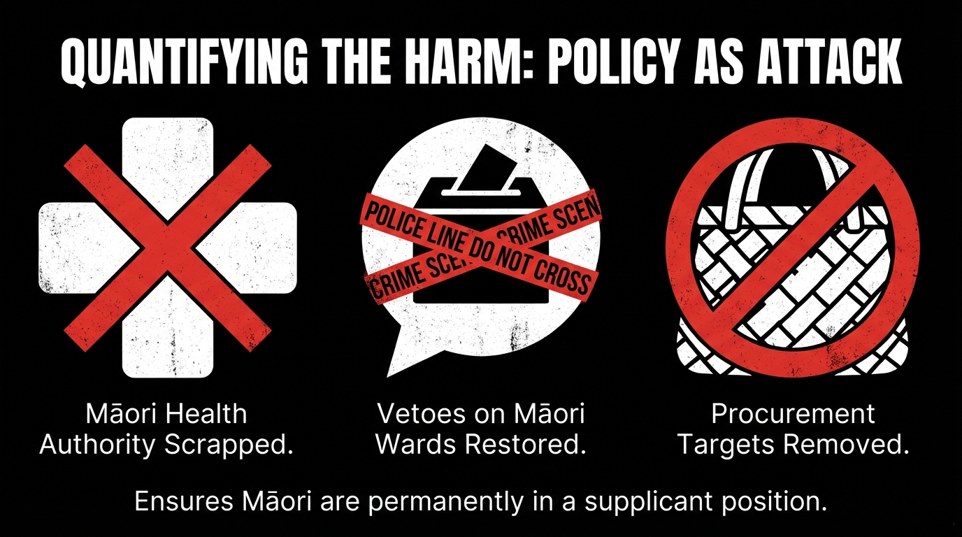 These moves strip Māori of both voice and economic leverage. They ensure that any “consultation” happens on Crown terms, with Māori permanently in a supplicant position.