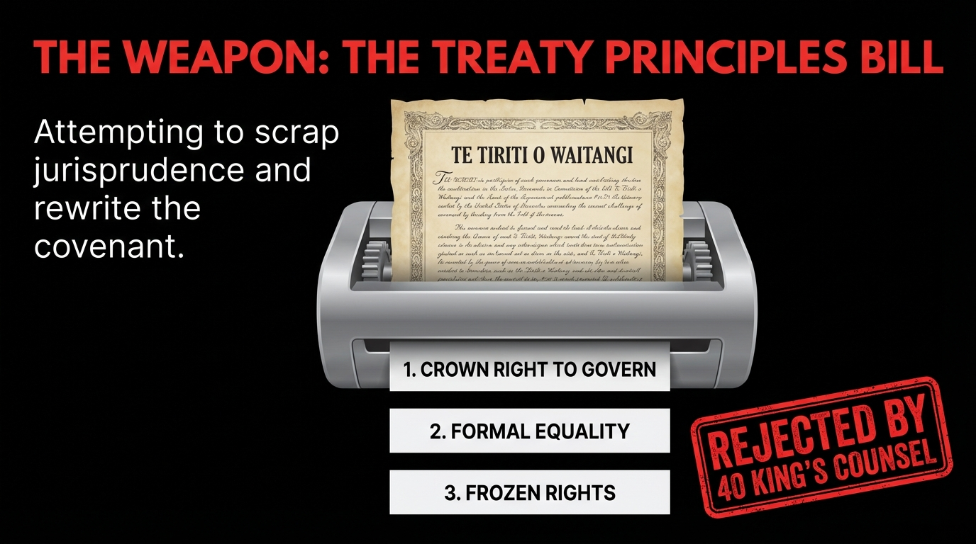 - Removed the ability of courts and the Waitangi Tribunal to continue developing Treaty principles beyond three narrow, Crown‑friendly slogans.