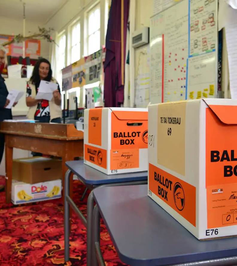 New Zealand local election ballot boxes in a polling station, highlighting the Maori electoral area Te Tai Tokerau.