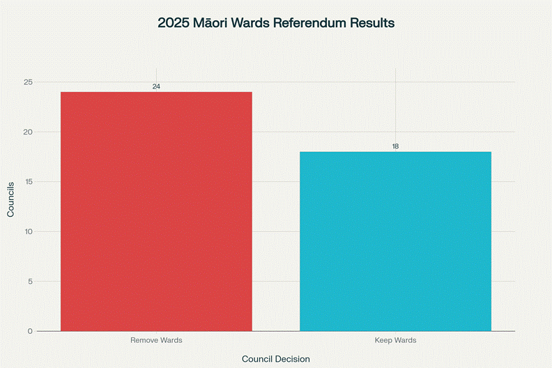 2025 Māori Wards Referendum Results: 24 councils voted to remove Māori wards while 18 voted to keep them, revealing deep divisions across Aotearoa.