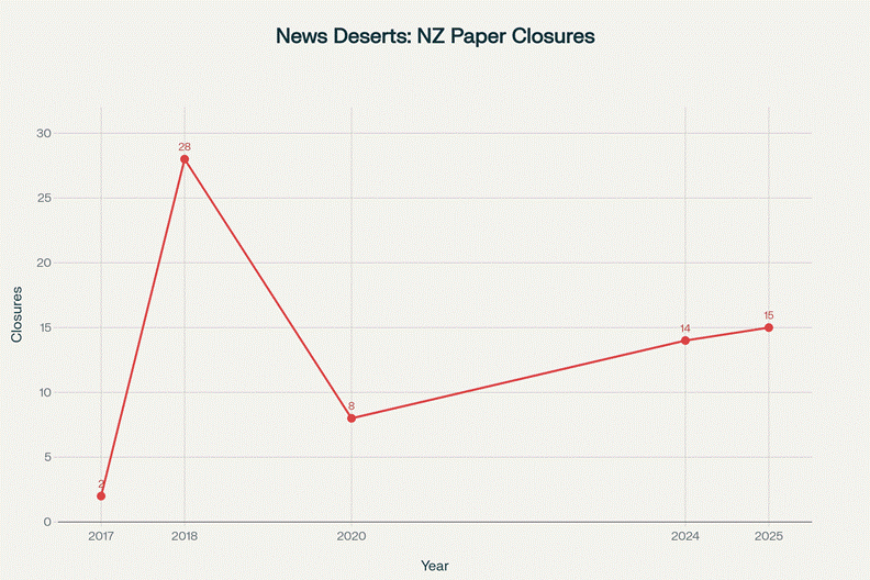 That democratic scrutiny now hangs by a thread. NZME proposes closing 14 community newspapers, including century-old titles. Stuff closed 15 Auckland papers in 2025. Between 2017 and 2025, 67+ community papers have shut down—creating “news deserts” where no professional journalists monitor councils, courts, or health services.[19][20][21][22][23][24]