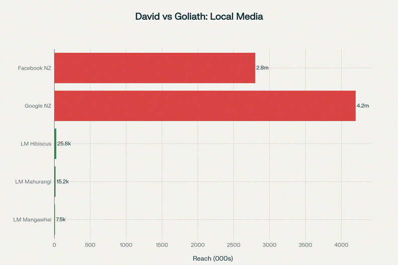 The asymmetry of power is stark: Facebook reaches 58 times more people than all three Local Matters papers combined, while siphoning advertising revenue offshore—yet only local journalists attend Kaipara District Council meetings, investigate rates rises, and hold local officials accountable.