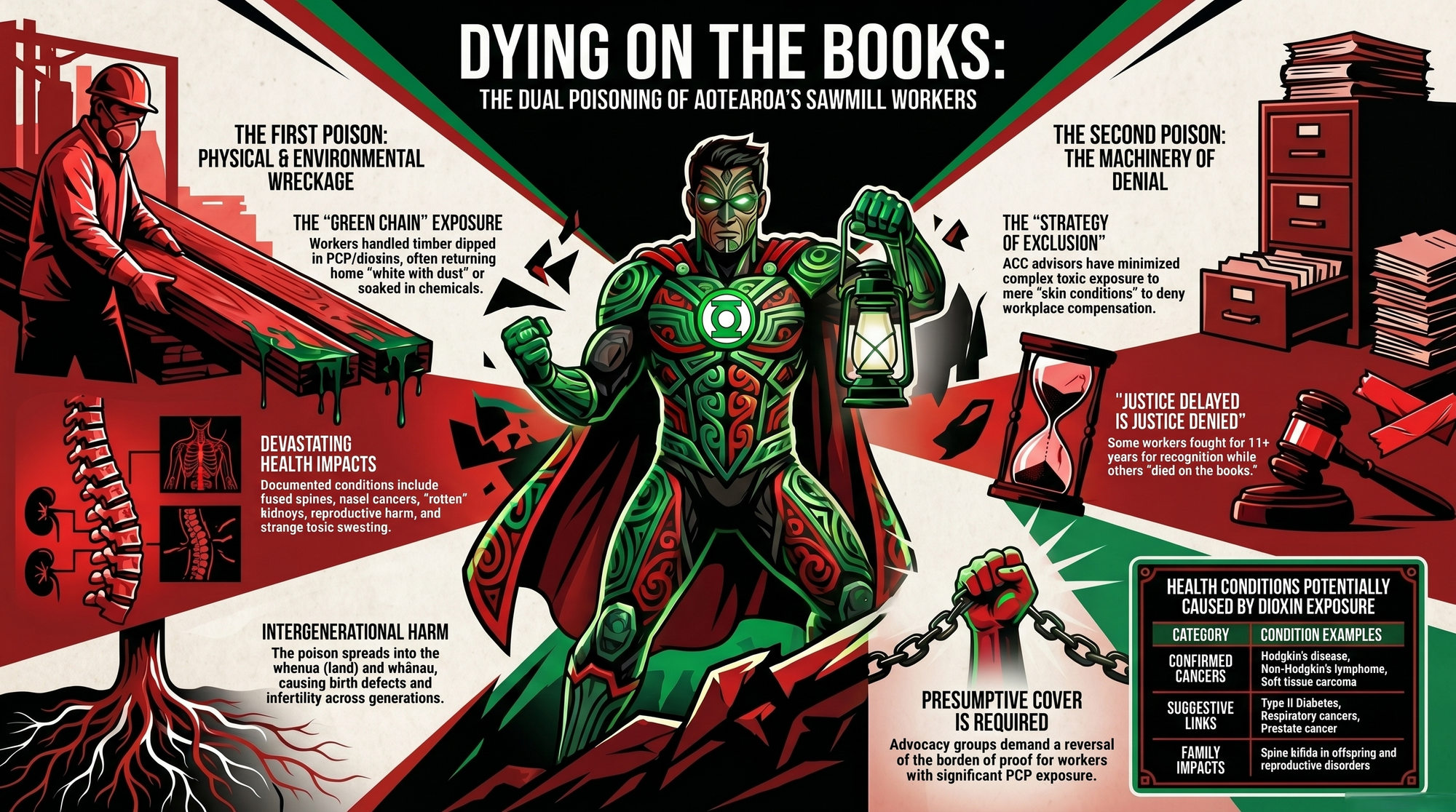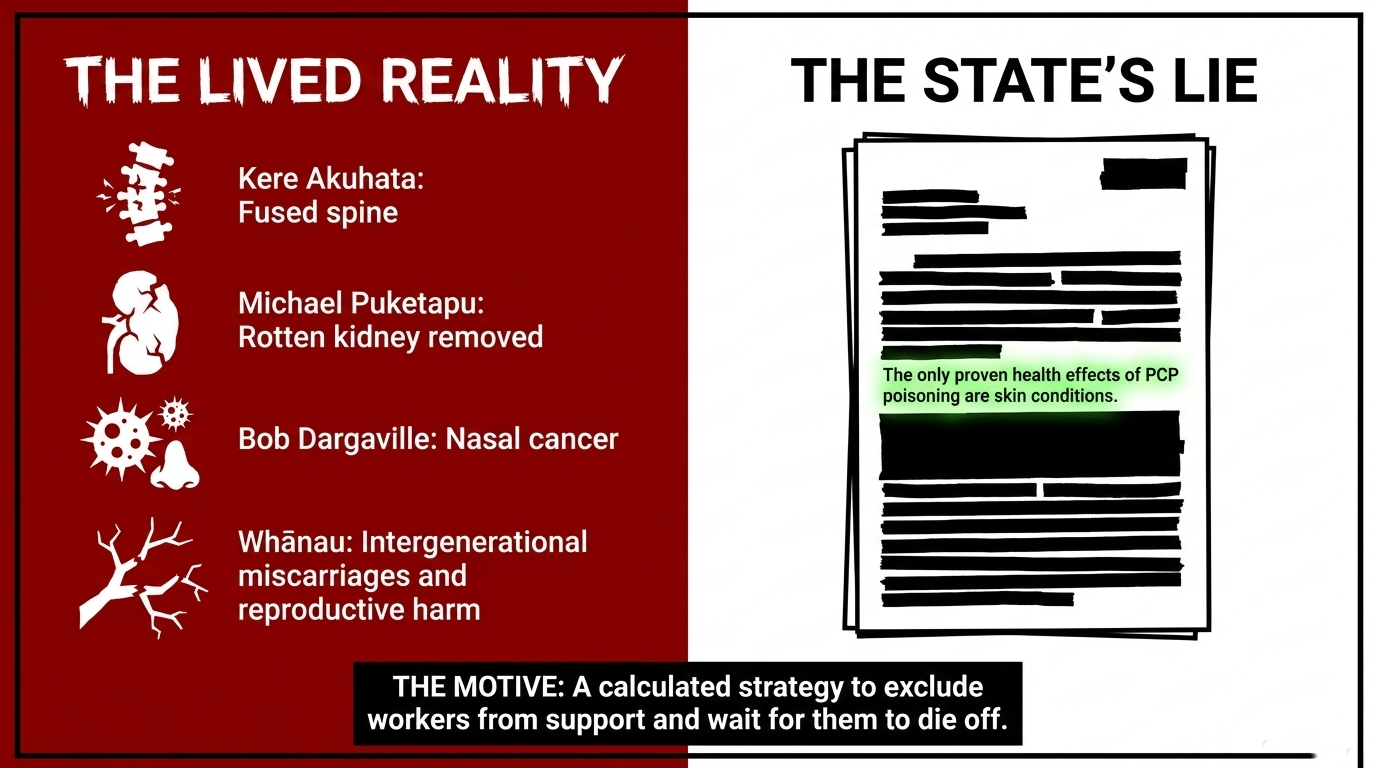 Joe Harawira fought for years to force recognition that PCP, dioxins, and furans had damaged workers, whānau, and whenua, yet Te Ara records that ACC refused workplace compensation because the illnesses could not be definitively linked to employment.