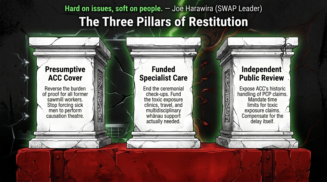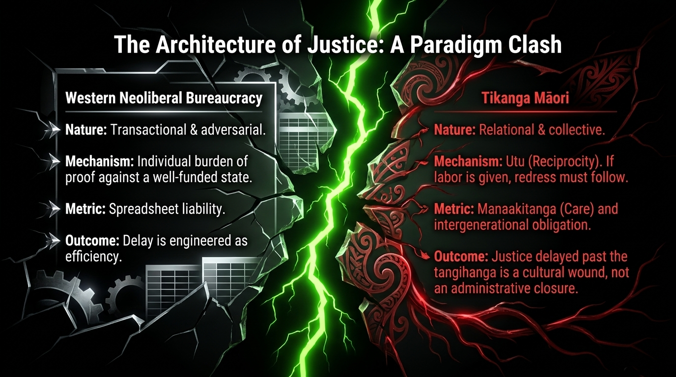 The tikanga impact is this: imagine a whare where one side keeps taking from the food basket and the other side is told to prove it is hungry. The relationship is already broken before the argument even starts. ACC broke utu by forcing poisoned workers to beg for what was already morally owed.