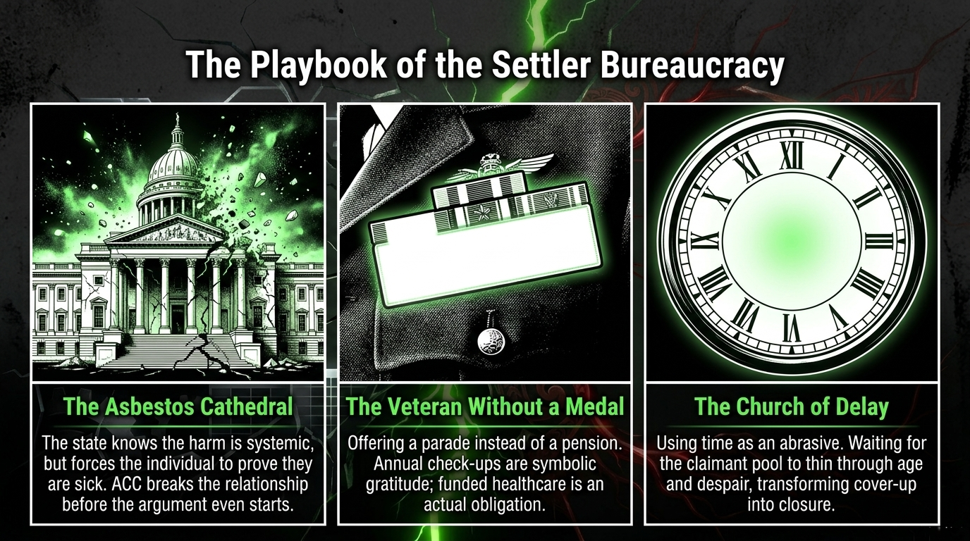 The second poison arrived by letter, by form, by medical threshold, by legislative exclusion, and by the quiet bureaucratic art of making sick men prove the obvious until they ran out of money, breath, or time, as described by Te Ara and E-Tangata.