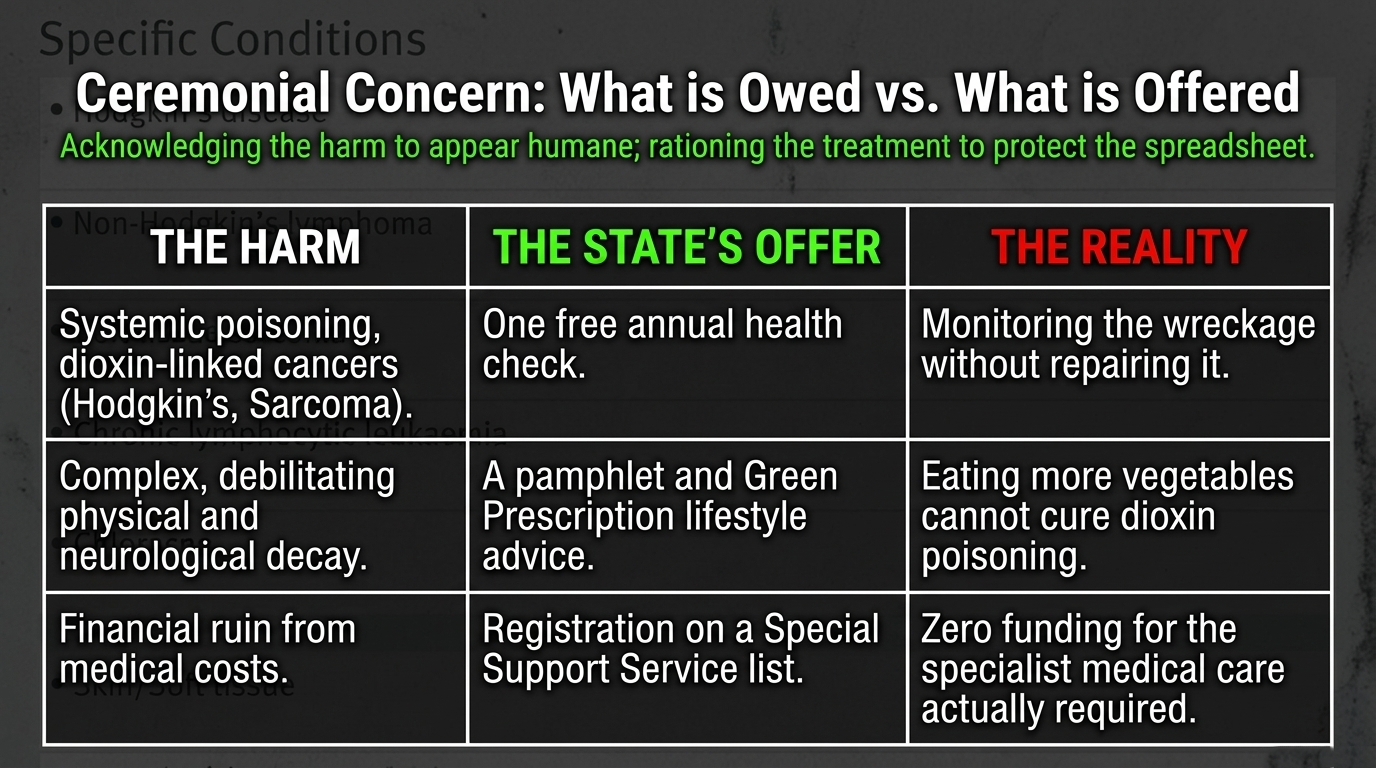 If soldiers came home from exposure to a toxic agent and were offered an annual check-up, some lifestyle advice, and a decade of causation disputes instead of comprehensive care, the public would call it betrayal.