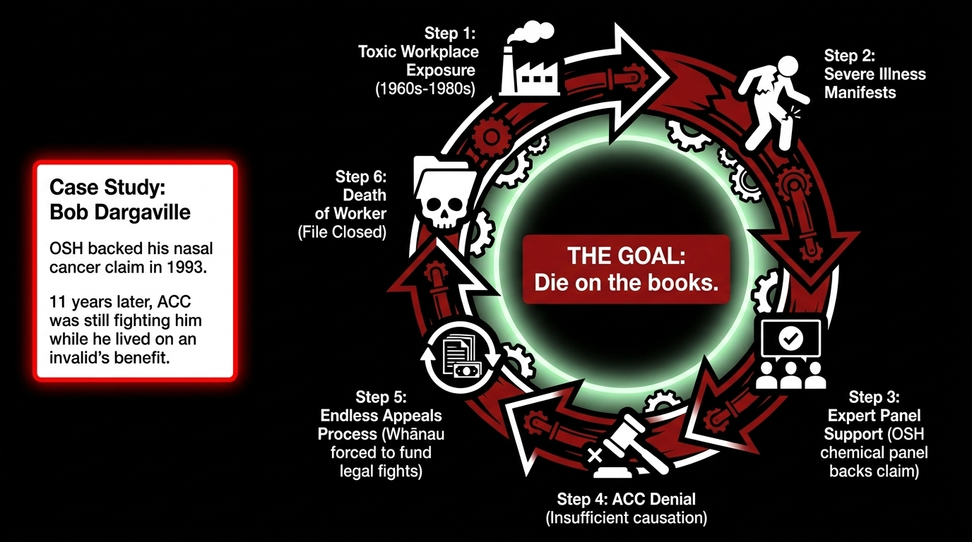 In this kaupapa, it functioned like a mausoleum clerk for a colonial economy — filing, narrowing, delaying, and waiting for men poisoned in the sawmills to die on the books.