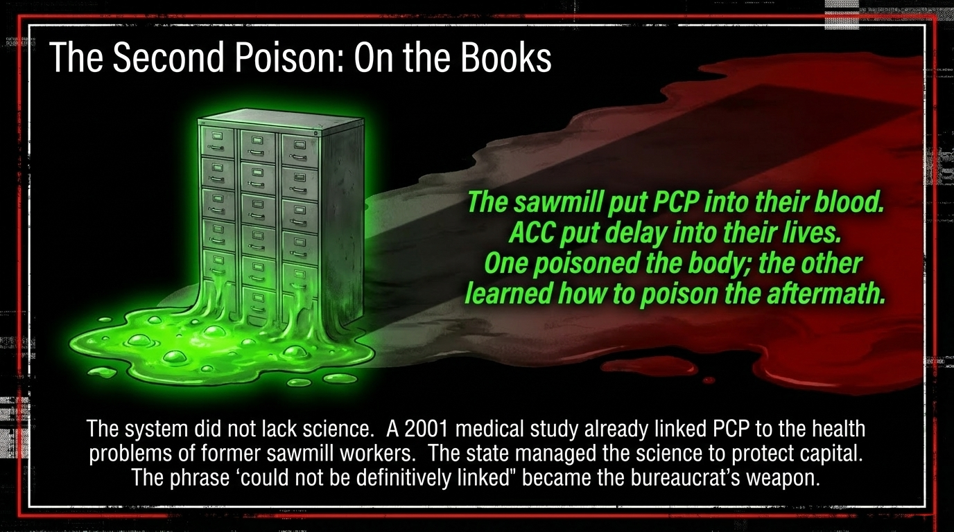 The sawmill put PCP into their blood. ACC put delay into their lives. One poisoned the body; the other learned how to poison the aftermath.