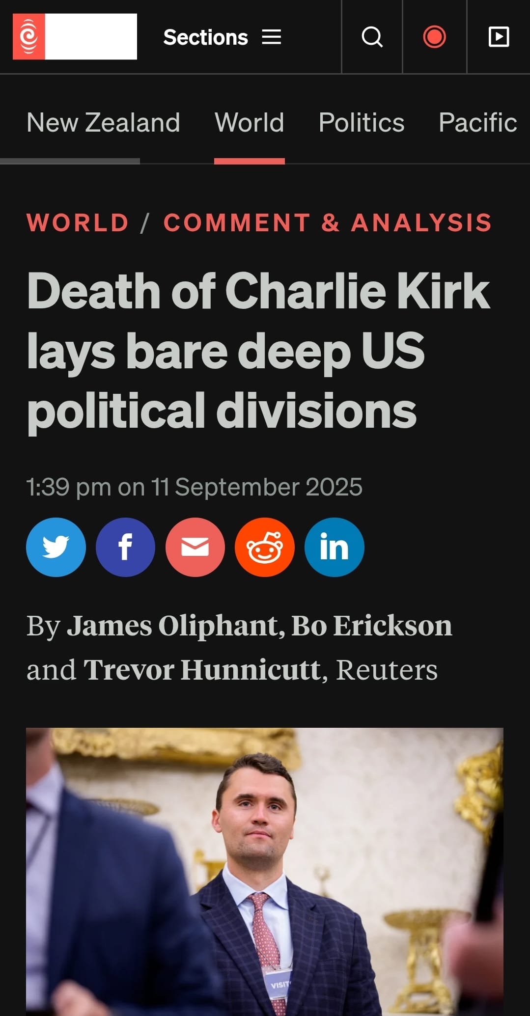 - https://www.rnz.co.nz/news/world/572762/death-of-charlie-kirk-lays-bare-deep-us-political-divisions