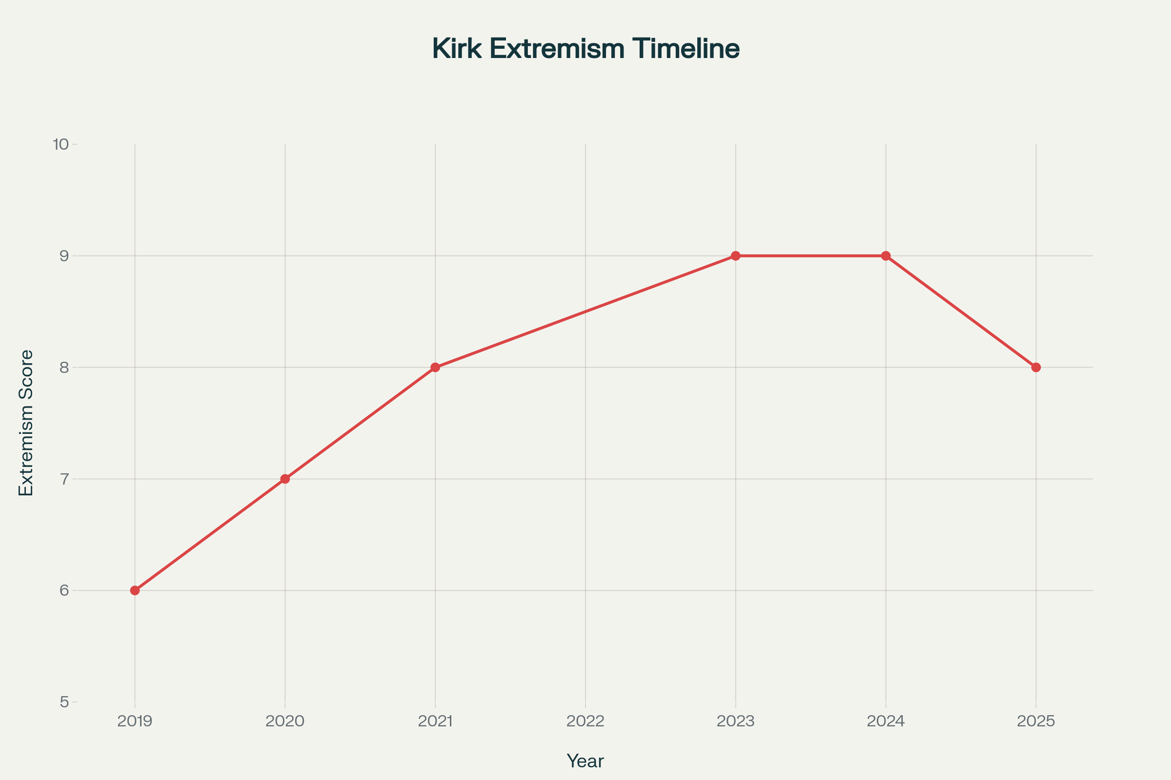 Charlie Kirk's rhetoric became increasingly extreme over time, culminating in promotion of white supremacist theories and civil rights denial