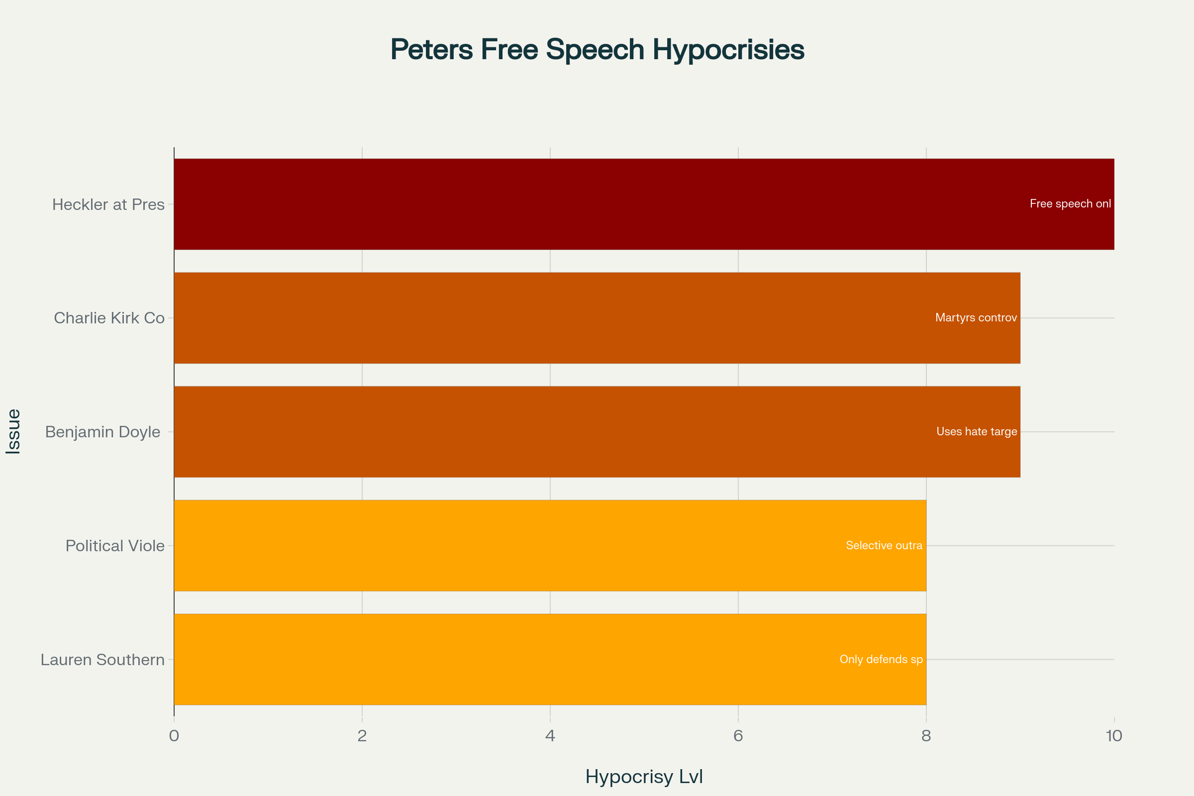 Both Peters and Kirk built their careers on weaponizing legitimate concerns about democratic participation while systematically undermining democracy for their political enemies. Their legacy is not one of principled commitment to free speech but of calculated manipulation designed to serve neoliberal capitalism and white supremacist power structures.