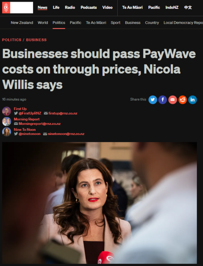 - https://www.rnz.co.nz/news/political/568294/businesses-should-pass-paywave-costs-on-through-prices-nicola-willis-says