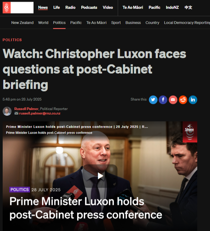 - https://ppl-ai-file-upload.s3.amazonaws.com/web/direct-files/attachments/images/2123776/918d6ca3-3c50-478a-8a83-c81b1eb0e03a/Watch-Christopher-Luxon-faces-questions-at-post-Cabinet-briefing-RNZ-News-07-29-2025_11_22_AM.jpg?AWSAccessKeyId=ASIA2F3EMEYET3PYAMT5&Signature=TTTQpUIw9Vwquj%2BHEo%2BXwcCW3tc%3D&x-amz-security-token=IQoJb3JpZ2luX2VjEHAaCXVzLWVhc3QtMSJFMEMCHz%2Fo%2FdO7c6MKgYZRCWpDJg5Wx%2Fg34k2vlFuzAvorqPYCIG39Pn%2B0KlzBCOQeL2X5UC5DTrBCFyXTlQkWKWyKDDApKvoECJj%2F%2F%2F%2F%2F%2F%2F%2F%2F%2FwEQARoMNjk5NzUzMzA5NzA1IgzNf%2FjsOaOutKfGmtUqzgSO7e0B798btcCyVVppBh2HeRyjxYpkSNWIeZbivdW8dwmrKO3yFJdfrq321%2BtrV7xGHV7MLJKDWKS3%2Fb8XCnB0ya29aLPf%2BMn%2F3%2FEF6R2ocgBQ9Cgx3y7QvL0OpPSvJHL2kBdkpJhPGxr8B11Jk%2BPyk4c95dObYO9ErFuU0sSkwp4JVXVjo%2BWyhobbXJotRPuG30yhU6Xl9cGwYgzT%2FGdwmTyi4WwI1cIQKOFMYK3hrToOfFL58QLdjjoNaUV9uI%2BKqVbLG%2FlLg7l9esTKyg9UV9yRtwrHZig8nWg%2BBIWZxY6WipcuHB%2FIKpnN%2F5UueHm689y340Po8NJKxw69PciO%2FrW89LhTGLnMaMGZrc077WRF0x%2FhGfCf7vjlgcHjc9YfeKuLPU3NhCOx052FW8TtkZR6TfHoHWrAyRS5taEcHAjJH%2BmiHU0w1n8JGgobEr5Z404xEHTOhRKn38QITTIzV2U%2BranDEH7yjpmPY0L1y5QQgRYhCIvH8OeBF%2Bh2eUjwbS63S6P10xVF4Ui0K3SmrY8IThsg14FDDdsQRHzWO6hNQRHdpy%2BTNREnKKN%2FIbo2uavCVEPMn1nHb7Lo%2B1Dg0DxQNelGm6ywqjkMDWZr8NtU%2B2I0gCsFd6vC8EcnnQMMdCX%2BR5mx60RUZgrGEsGTAbjBoKLW1fokHFAvjMObbJrmvMr0YuCHioUV2LOTMOngUkGuOqlN1sUSIgLwzkzkCXYKzXMHRuNH1LR7TN4ZLmzjdxSqTNRO7eGTj6on446lRGLZ7tFI2kUlyQa7RDCciKDEBjqcAcGD81WA9COEuyKnEfZRsOzIFTy4ZCx%2B55AN7TezK3XUiPy8Dz0nj%2BQGTd1urqV5qI0hUyg9ib4SNZ2Gi2%2F89azWuU%2BTRU%2FrZSJhMPMWvTu4AP2WzQzNA1QTYbLZ3DOvvR5%2FdV4az%2FBR0xeylflGspRsFEXoFanaWcSZLYt%2B5Enq495mOtJKUR9rp%2FiBNSoEA%2BHQF7WnnUjvIiYVEA%3D%3D&Expires=1753746053