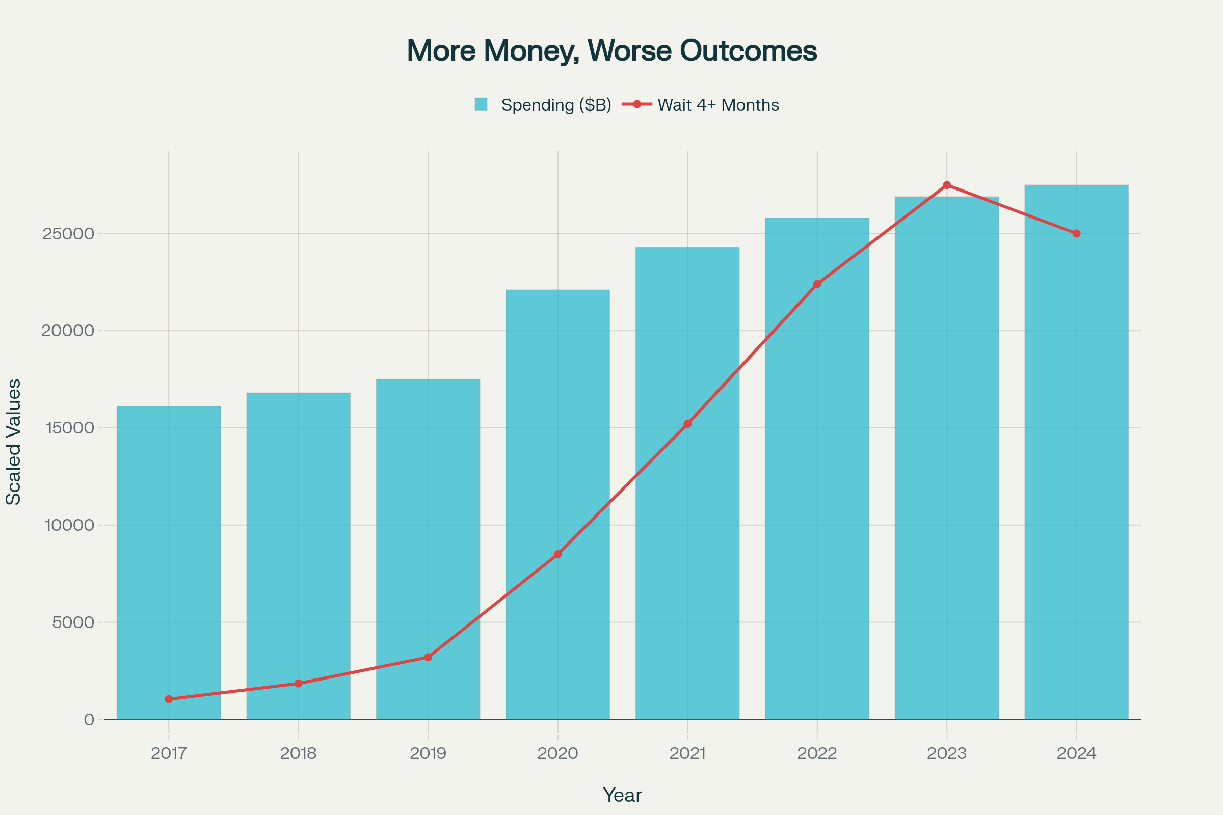 Health spending versus elective surgery waiting lists showing how billions in additional funding resulted in dramatically worse patient outcomes, exposing government incompetence