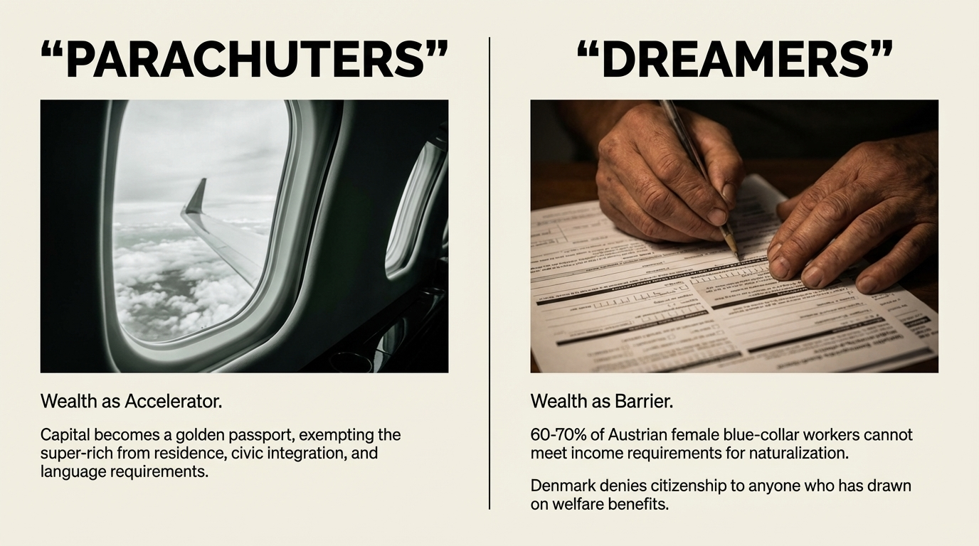 2. Dual legal regimes: Wealthy “Parachuters” purchase citizenship through cash payment, bypassing income thresholds, language tests, residency, and integration requirements that bar 60-70% of working-class citizens from naturalizing, while “Dreamers” with deep ties face deportation.