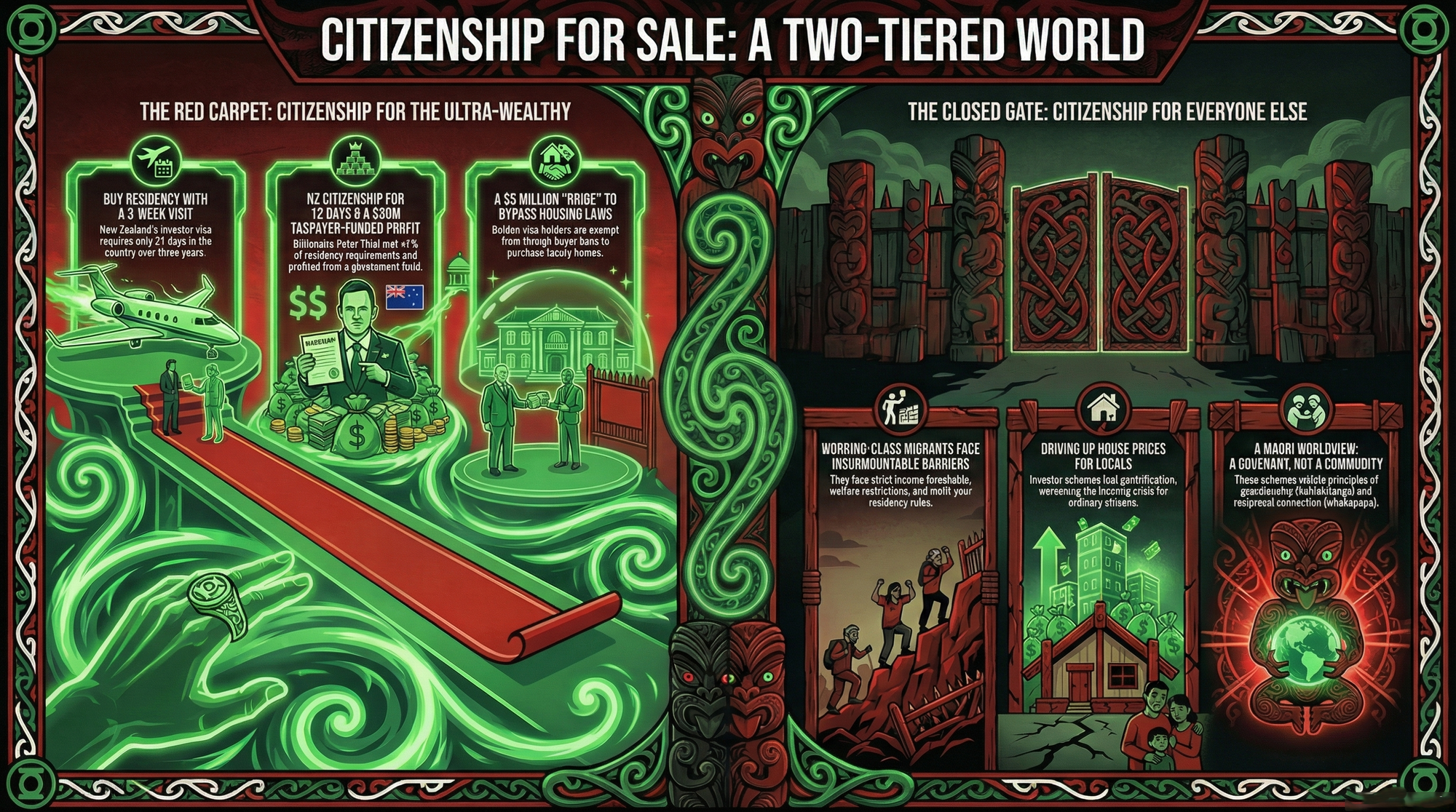 The evidence is unambiguous. Citizenship—once conceived in modernist thought as equal status among members of a political community—is being commodified. Small island states in the Caribbean derive up to 37% of their GDP from selling passports. Malta ran a billion-euro “golden passport” scheme until the European Court of Justice ruled it illegal in April 2025, declaring it a “commercialisation of EU citizenship”. Meanwhile, New Zealand’s own Government is “dusting off” investor visa schemes to attract wealthy foreigners, explicitly acknowledging they “don’t love” renting and prioritizing their property acquisition over housing affordability for ordinary Kiwis. From the perspective of Te Ao Māori—grounded in principles of kaitiakitanga, whakapapa, and reciprocal obligation—these schemes represent a profound violation: they sever citizenship from social membership, enable extractive relationships with whenua, and subordinate Indigenous self-determination to neoliberal governance frameworks.This essay traces five interconnected dynamics through which CBI schemes constitute class warfare: (1) the resurrection of property-based citizenship, (2) the creation of dual standards between “Parachuters” and “Dreamers,” (3) structural violence against ordinary citizens, (4) the racial and colonial hierarchies embedded in global mobility regimes, and (5) the mauri-depleting transformation of citizenship from reciprocal bond to market transaction.