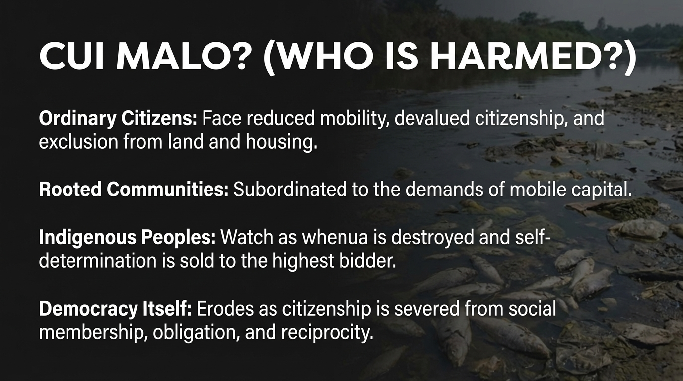 But “Cui malo?”—who is harmed?—reveals the class warfare. Ordinary citizens face reduced mobility, exclusion from land and housing, devalued citizenship, and declining public services as tax bases erode. Long-term residents confront economic barriers to naturalization while “Parachuters” bypass all requirements. Democratic legitimacy erodes as citizenship decouples from social membership, obligations, and reciprocity. Indigenous peoples watch foreign capital dictate development priorities, destroy ecosystems, and subordinate self-determination to investor interests. And the climate crisis accelerates as the wealthy purchase escape routes while contributing to the catastrophe from which they flee.