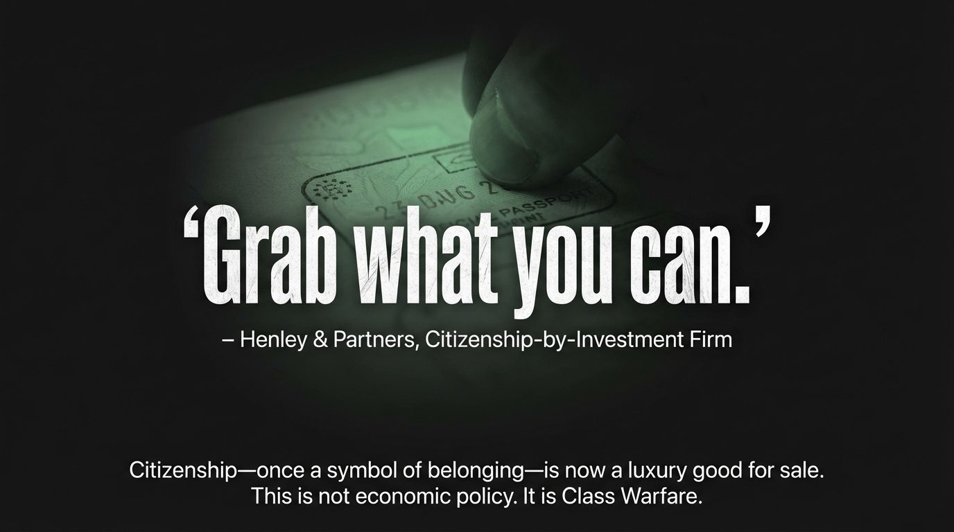 This is class warfare distilled: privatize profits, socialize losses. Grant the wealthy citizenship as “apocalypse insurance” while ordinary migrants face deportation for minor infractions.
