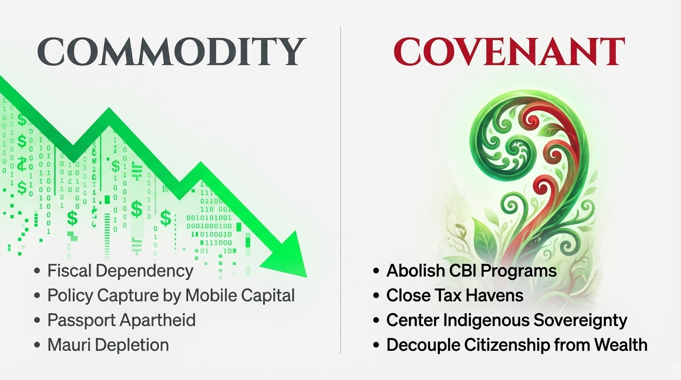5. Mauri depletion: CBI transforms citizenship from reciprocal covenant (obligations to community, care for whenua, intergenerational responsibility) to market transaction, severing membership from whakapapa, kaitiakitanga, and mana—a spiritual and political violence that Indigenous peoples recognize as settler-colonial extraction.
