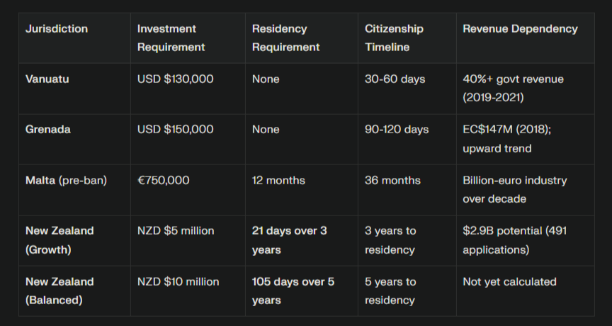 By December 2025, Immigration New Zealand data showed 491 golden visa applications covering 1,571 people, representing a “potential minimum investment of $2.9 billion”. The Government frames this as economic growth, but it mirrors the fiscal dependency dynamics that trapped Caribbean states. When Vanuatu derived 40%+ of government revenue from CBI, it became captured by the need to prioritize investor interests over citizens. New Zealand risks the same trajectory: as the Government becomes reliant on golden visa capital to meet infrastructure spending targets, policy will be subordinated to investor demands.