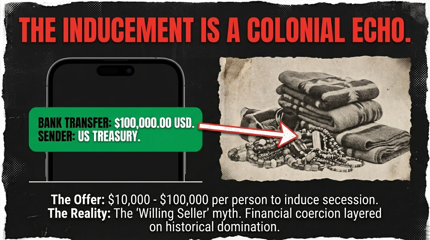 Let me be abundantly clear: this is not an offer. This is inducement disguised as generosity. It’s the modern equivalent of the colonial-era “willing seller” myth that Māori know intimately from land confiscations. It’s exactly what happened in Aotearoa when the Crown showed up with trinkets and promises, took the land, then disappeared when the promises evaporated.