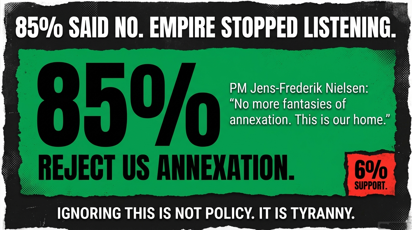 - Greenlanders overwhelmingly reject US rule. 85% said no. 6% said yes. That’s not ambiguous.