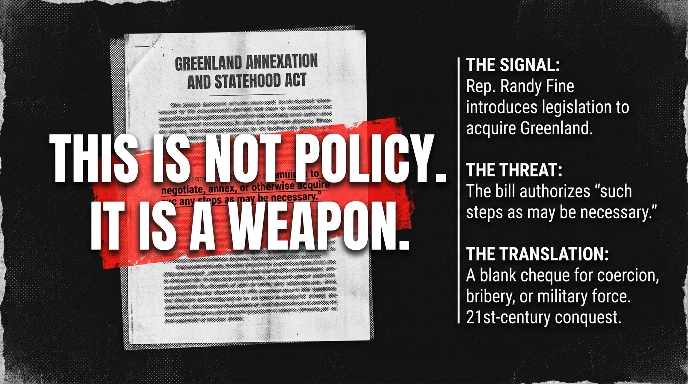 A trusted supporter sent me a link from The Hill documenting that Florida Republican Randy Fine has introduced the “Greenland Annexation and Statehood Act”—legislation that would hand Donald Trump a blank cheque to seize Greenland and fold it into the United States as the 51st state.