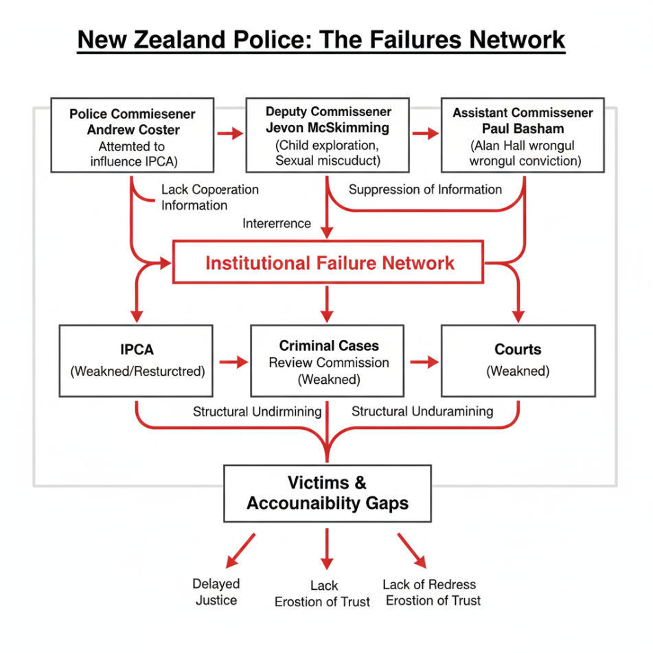The unravelling of New Zealand Police in late 2024 and 2025 exposes a cui bono—who benefits—that politicians and media have barely named. While the Independent Police Conduct Authority released a devastating 135-page report on 11 November 2025 revealing “serious misconduct” by former police commissioner Andrew Coster and multiple senior officers in their handling of Jevon McSkimming’s sexual abuse allegations, the government simultaneously restructured the Criminal Cases Review Commission (CCRC) to ensure it could not investigate systemic police wrongdoing.[2][3]