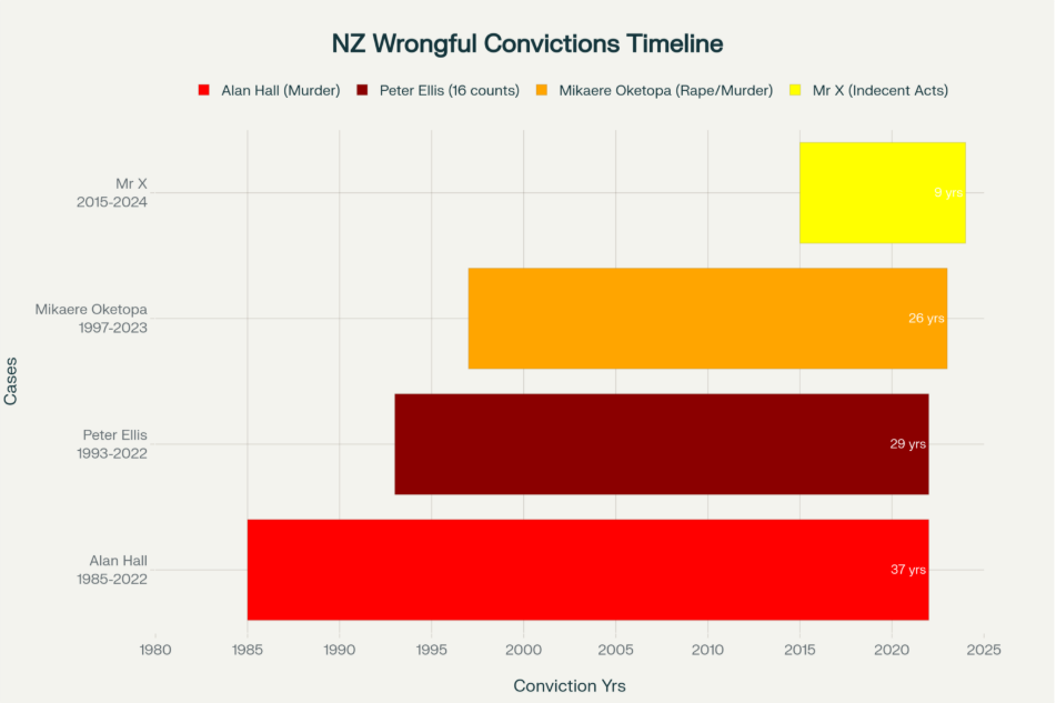 [Chart: Major New Zealand Wrongful Conviction Cases Timeline]