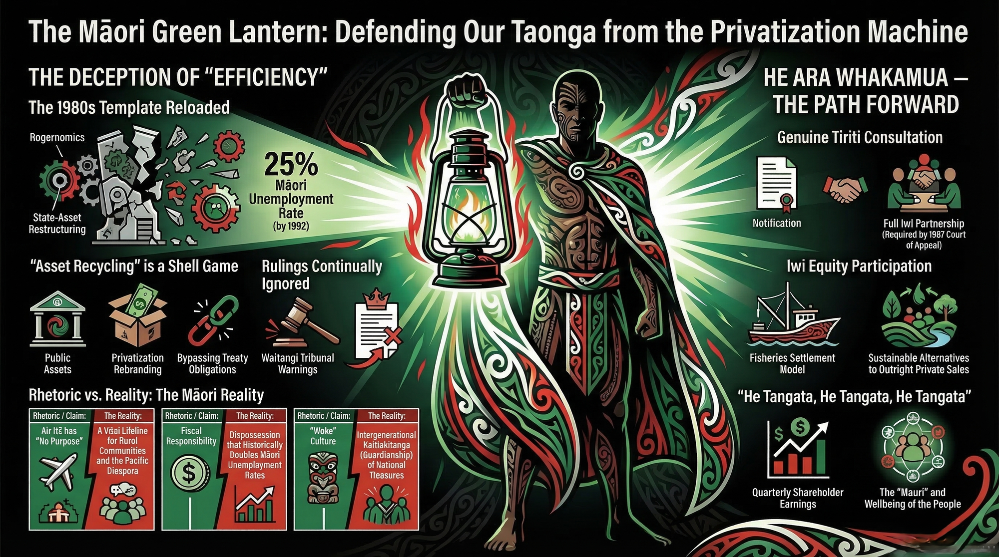 This is not a call for nostalgia. It is a call for tino rangatiratanga — genuine self-determination in economic decisions. Before any future asset sales are considered:
