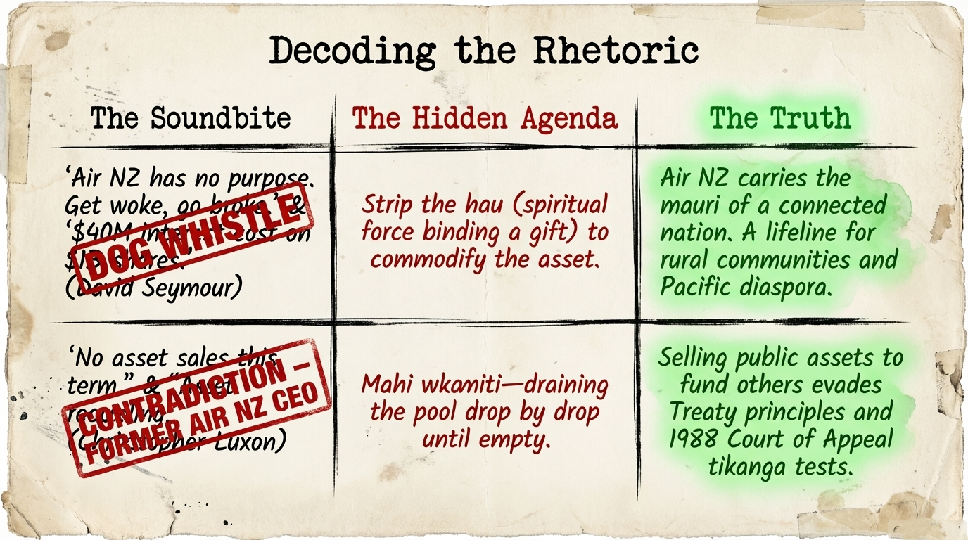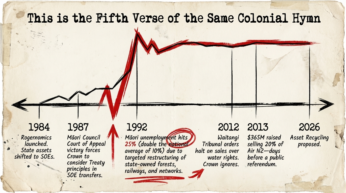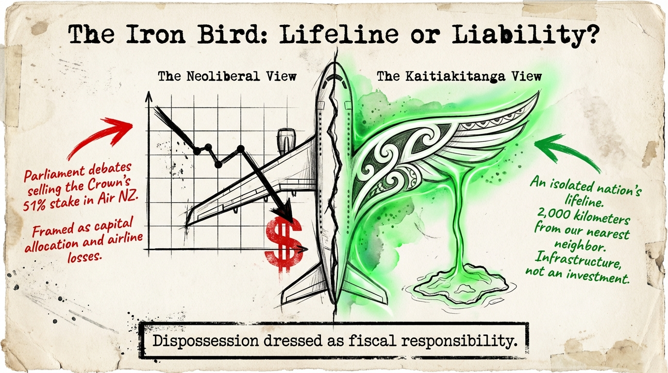 David Seymour calls Air New Zealand a liability, as reported by RNZ. The Waitangi Tribunal calls Crown assets a Treaty obligation. Luxon calls this a non-issue for this term. History calls it a pattern. And Māori — who have watched 25% unemployment, community collapse, and the quiet sale of the nation's connective tissue documented by Te Ara — call it by its true name: dispossession dressed as fiscal responsibility.