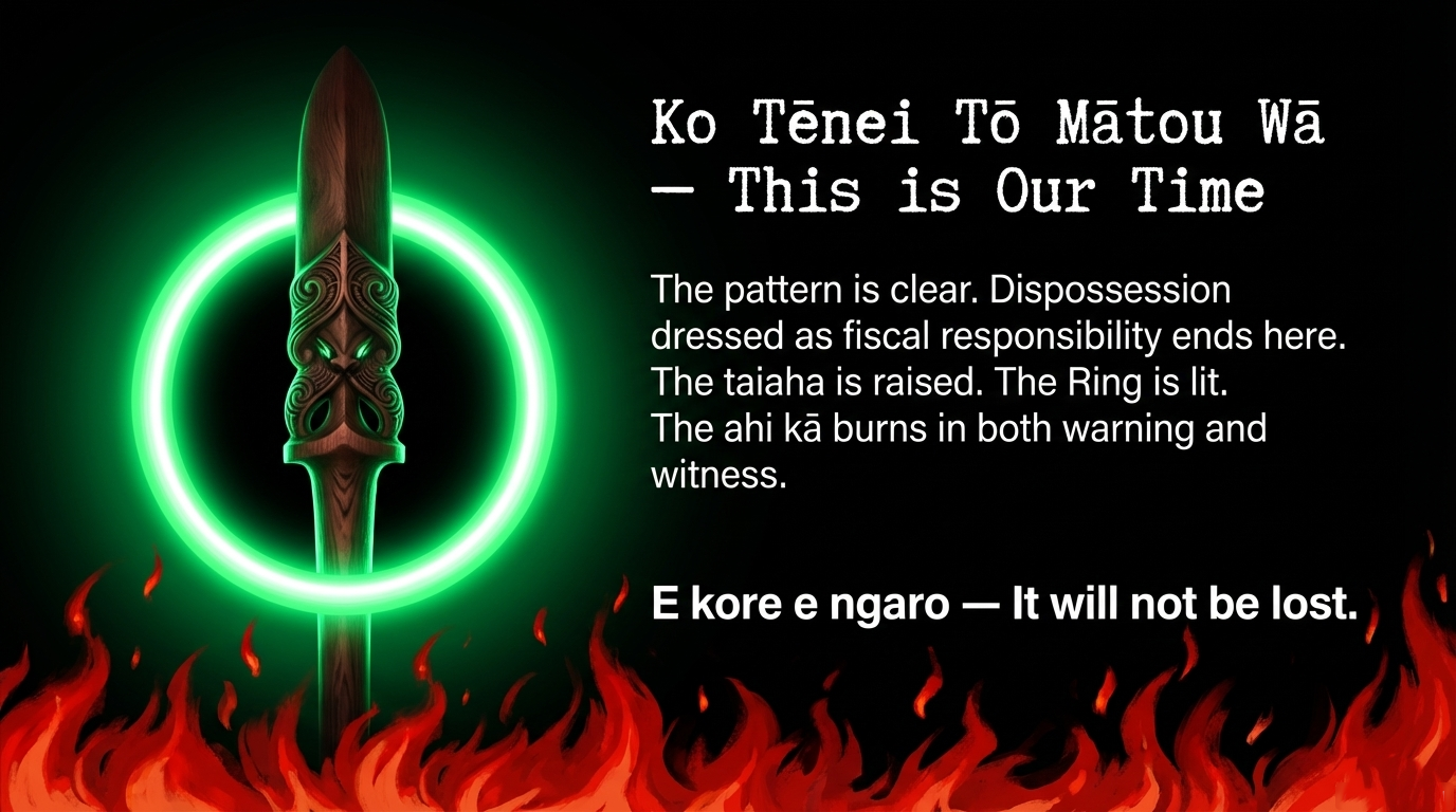 The taiaha is raised. The Ring is lit. The ahi kā burns. Until the Crown honors its obligations, it burns in both warning and witness.