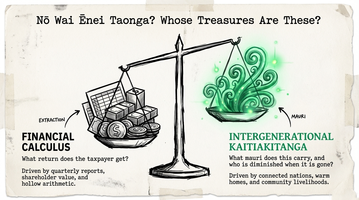 On one side: the shareholders, the ACT Party, the asset recyclers, the "efficiency" evangelists whose gospel has consistently impoverished tangata whenua. On the other: the people, the whenua, the wai, the mauri — and a legal and tikanga framework the Crown has violated repeatedly and is now primed to violate again.