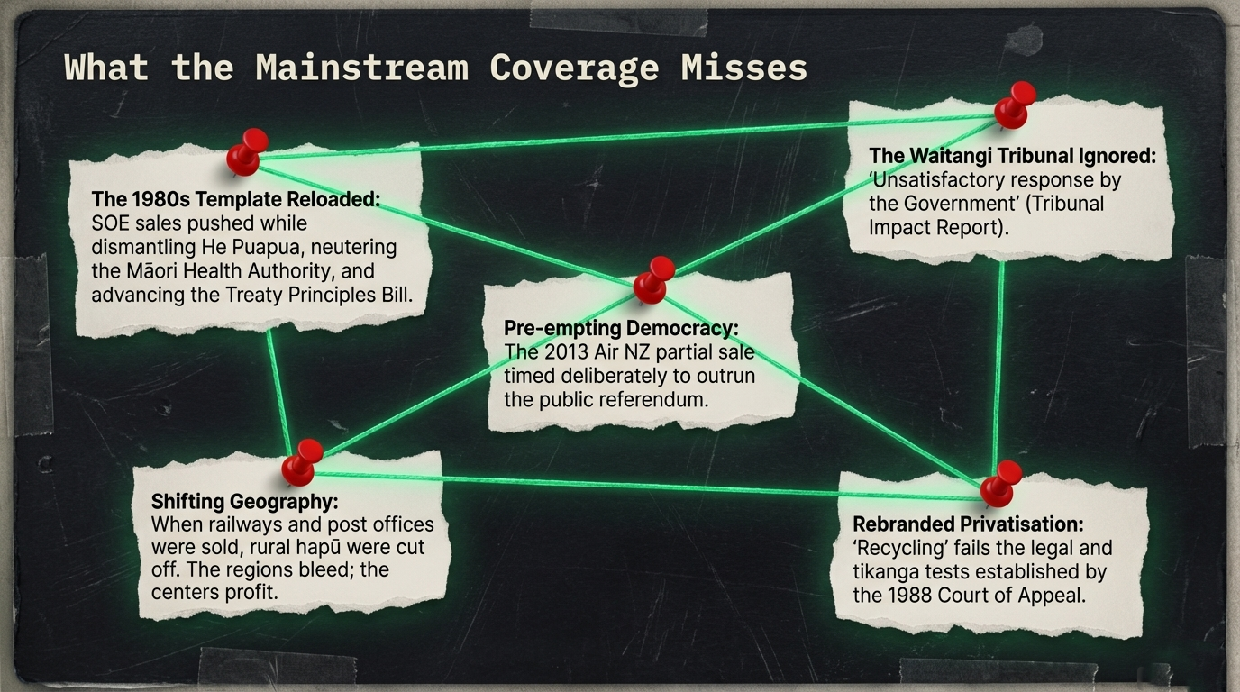 The New Zealand Māori Council's case established that the Crown cannot transfer assets in ways inconsistent with Treaty principles, as detailed in New Zealand Treasury's consultation documents. "Asset recycling" — selling public assets to fund others — faces the same legal and tikanga tests. The question of whether Māori have residual interests in Crown SOE assets has never been fully settled. Any sale without proper Tiriti consultation would repeat the violations the Waitangi Tribunal has already documented.