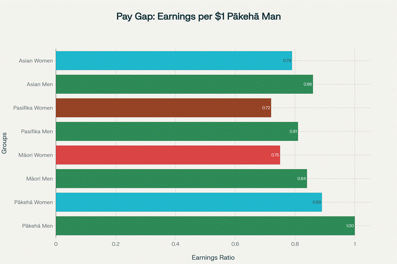 · Pasifika women: earn $0.72 per $1 that Pākehā men earn. A 28% wage penalty (RNZ, 2024)