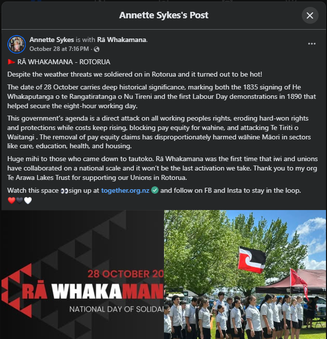 Annette Sykes named the target at Whakamarumaru Whakaputanga o Mana Motuhake: this government’s agenda is “a direct attack on all working peoples’ rights, eroding hard-won rights and protections while costs keep rising, blocking pay equity for wahine, and attacking Te Tiriti o Waitangi.”