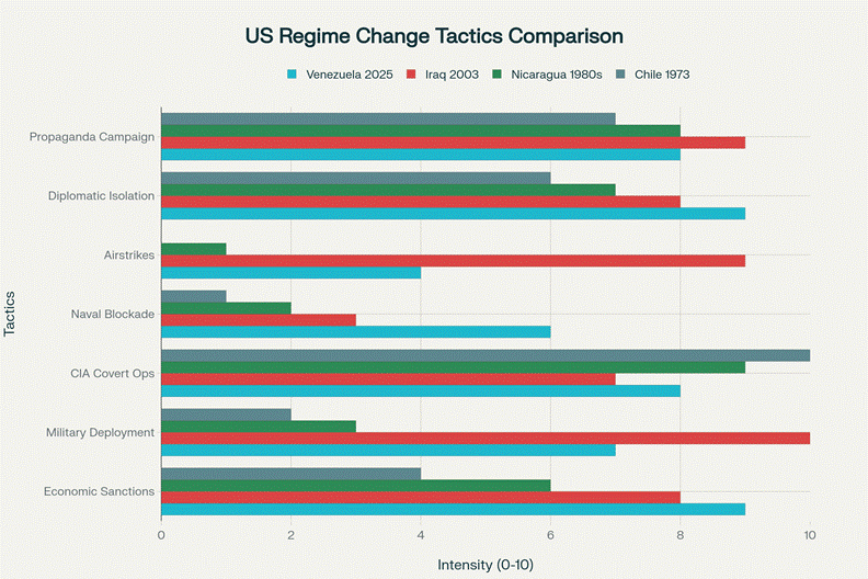 The tactics being deployed against Venezuela combine the worst elements of multiple previous US regime change operations. Like Iraq in 2003, there is a massive military buildup sold on false pretenses. Like Nicaragua in the 1980s, there are CIA covert operations and support for opposition forces. Like Chile in 1973, there is economic warfare designed to destabilize the government and encourage a military coup.
