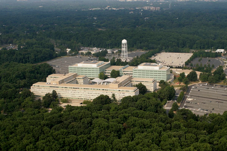 Aerial view of the CIA headquarters in Langley, Virginia, showing the main office buildings and surrounding areas.