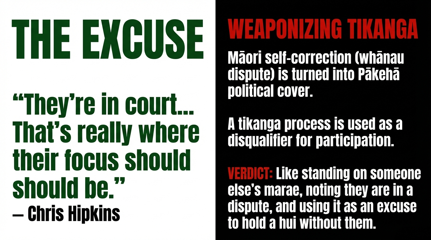 All of that is real, messy, and painful. But when Hipkins weaponises that process to justify freezing Te Pāti Māori out of a Waitangi platform, he turns Māori self‑correction into Pākehā political cover. The colonial move is simple: Māori conflict becomes a convenient prop to sideline Māori power, while the Pākehā‑dominant parties talk calmly about unity and stability.