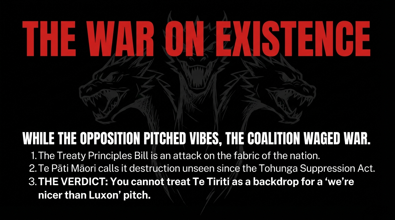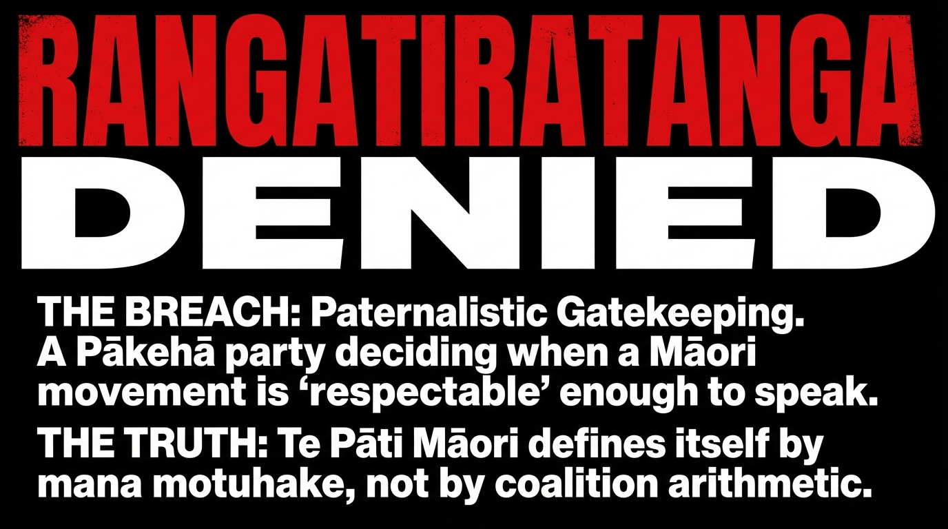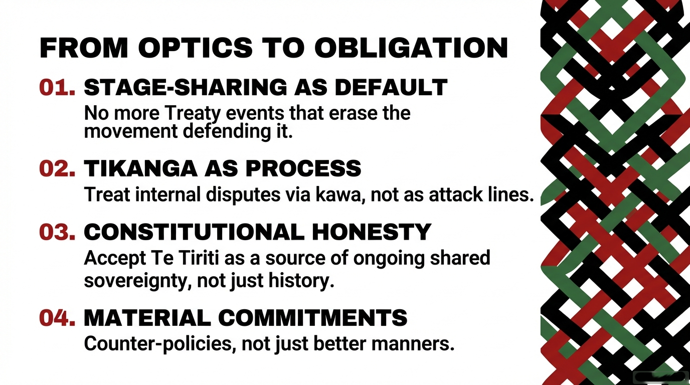that Te Tiriti defence cannot wait for the next “sensible” government line‑up. It says our rangatiratanga includes the power to fund Māori truth‑telling that names the hypocrisy of photo‑ops on stolen ground, calls out both open attacks like the Treaty Principles Bill and polite exclusions like freezing Te Pāti Māori off the Waitangi stage, and insists that tikanga is constitutional law, not a branding option.