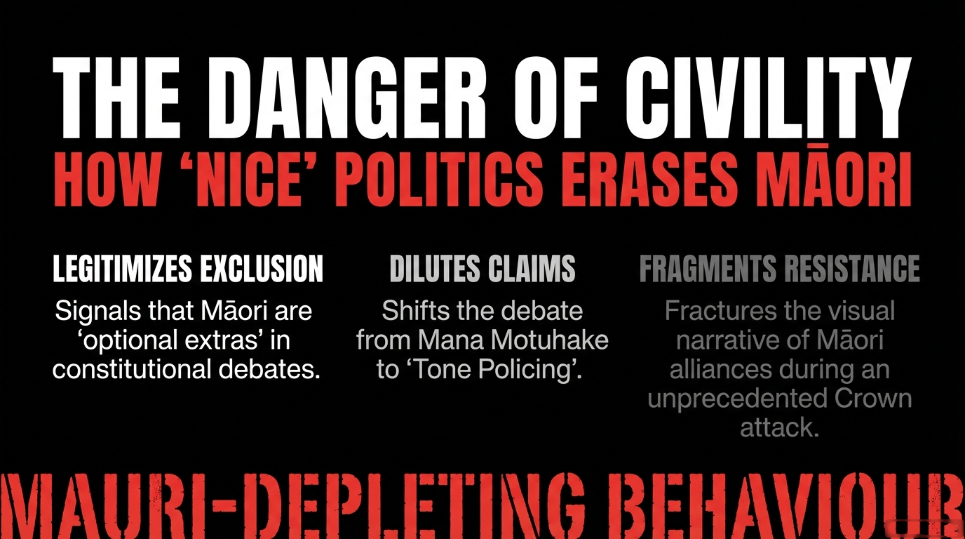 it drains the life force of movements by treating Māori as risky optics rather than rangatira whose presence is indispensable to any Te Tiriti kōrero.