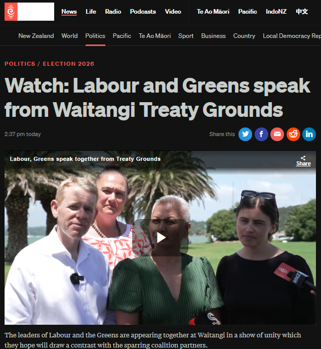 On one side, Te Pāti Māori launches the Hīkoi for Te Tiriti and calls the bill an attack “on the fabric of this nation.” Green Party On the other, Labour and Greens offer a joint presser with zero new commitments, marketing themselves as the polite alternative to a coalition that is still advancing that very attack. RNZ