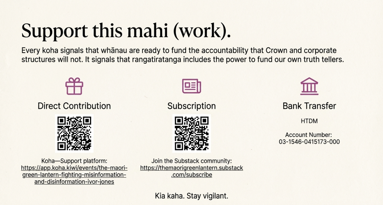 Every koha signals that whānau are ready to fund the accountability that Crown and corporate structures will not provide. It signals that rangatiratanga includes the power to fund our own truth tellers.