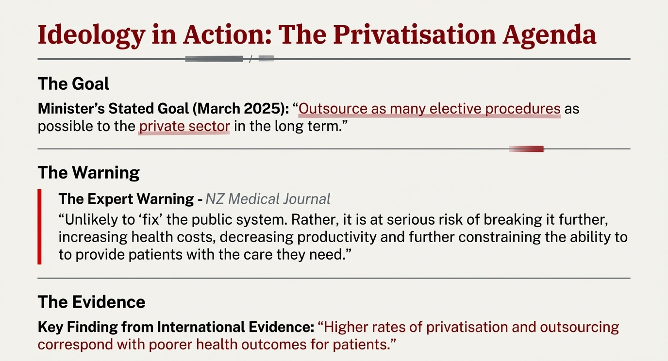 In June 2025, Brown directed Health NZ to give private hospitals 10-year outsourcing contracts for elective surgeries. Ten years. A decade of locked-in privatisation, no matter who wins future elections, no matter what evidence emerges, no matter how many patients are harmed.