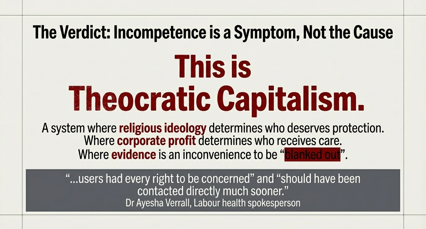 This is not governance. This is theocratic capitalism—a system where religious ideology determines who deserves protection, corporate profit determines who receives care, and evidence is an inconvenience to be “blanked out” when it conflicts with predetermined conclusions.