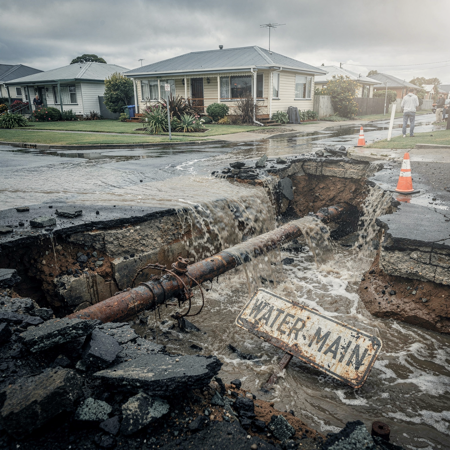 A broken water pipe flooding a New Zealand suburban street, showing rusted infrastructure and decades of neglect—visualising the infrastructure crisis.