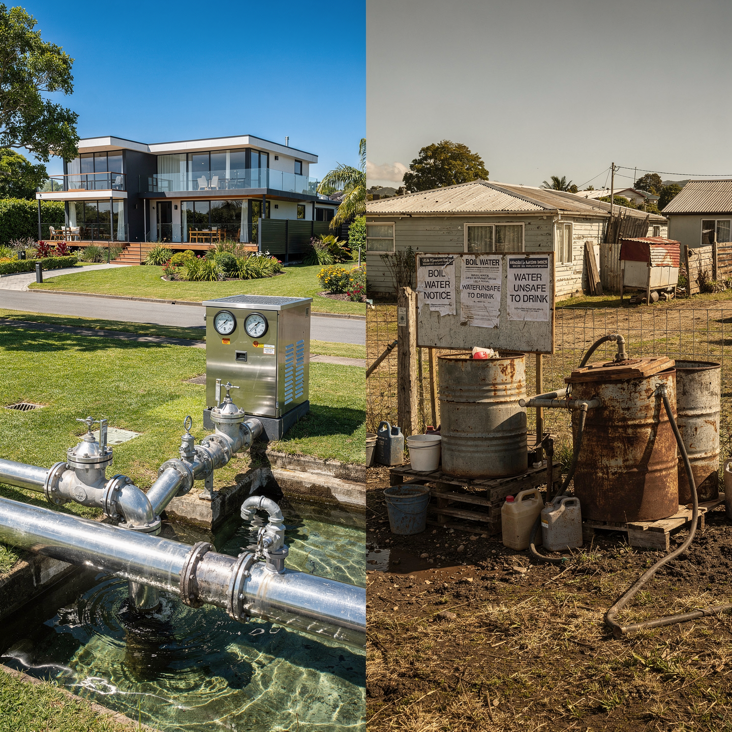 Wealthy Auckland suburb with pristine water infrastructure on one side, and a rural Māori community with makeshift water tanks and boil-water notices on the other—exposing environmental racism and inequity