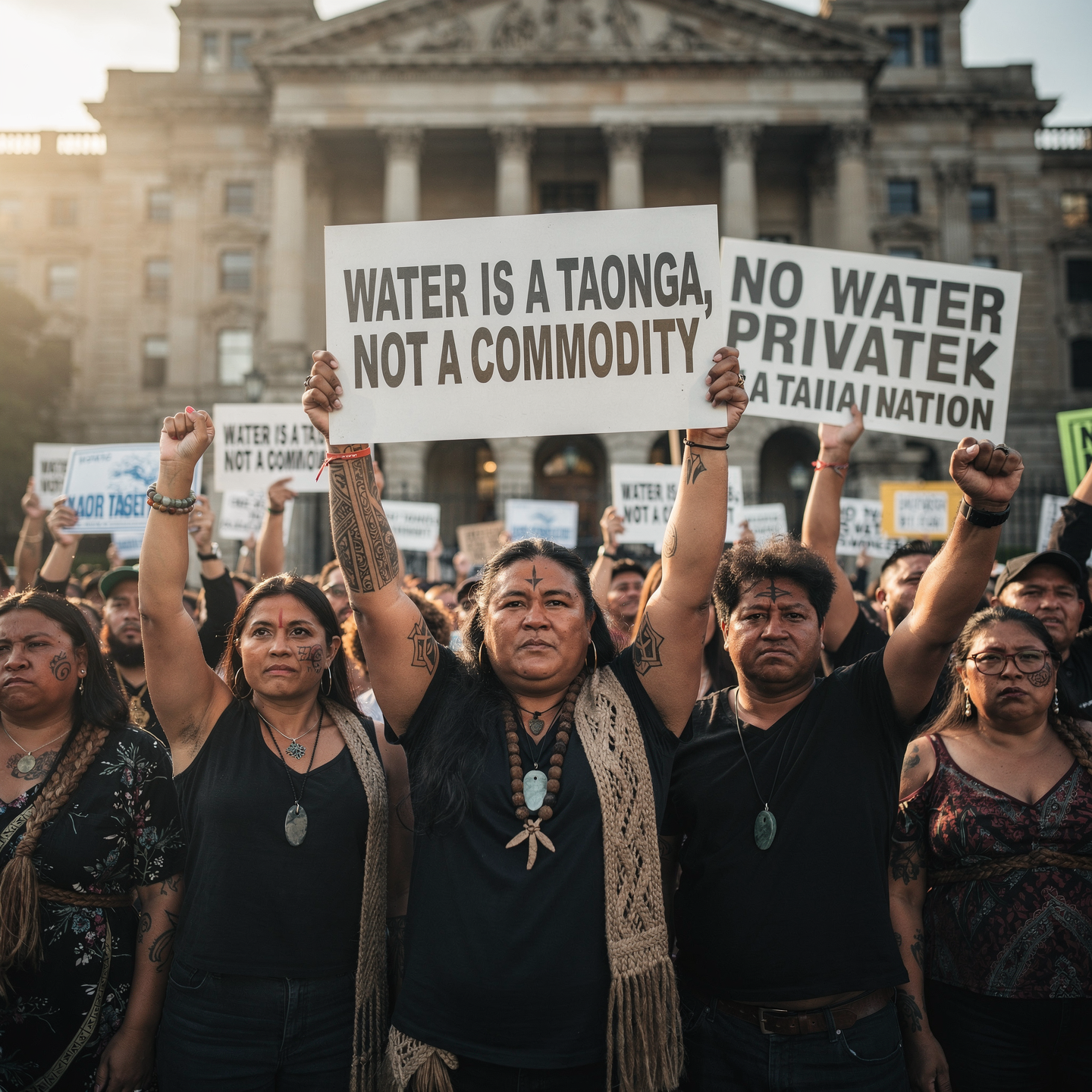 Māori and community activists protesting - “Water is a Taonga, Not a Commodity” and “No Water Privatisation” outside Parliament—embodying resistance and collective action